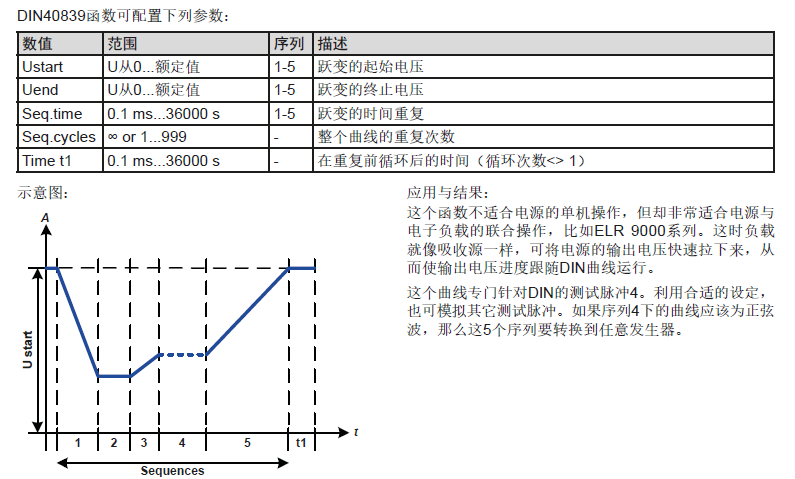 拿PSI 9000系列的產品舉例,其內置有函數發生器功能,其中有一個DIN40839函數,是基于DIN 40839 / EN ISO 7637()定義的曲線,且只能應用到電壓數值上。它會復制汽車引擎啟動期間電池電壓的進展。