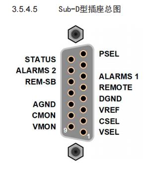 如果通過電源的模擬接口控制,則會顯示“遠程:Analog”。該模擬接口為背面板的Sub-D插座,可以通過相應的連接線接上Sub-D公頭和其相連。其中可以通過不同的引腳控制電壓,電流,功率等模擬量(VSEL,CSEL,PSEL),也可以通過VMON,CMON獲取電壓,電流值;還可以通過REM-SB等來控制電源的輸出與否,功能非常強大。