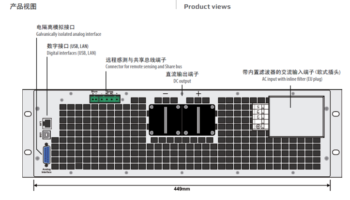 所有型號在其后板默認有兩個電隔離數字接口(標準版:1x USB & 1x Ethernet,帶3W選項的:1xUSB & 1x GPIB)。可通過發送SCPI語言指令或ModBus RTU協議,經USB與Ethernet接口,控制和監控產品,而GPIB僅支持SCPI語言。