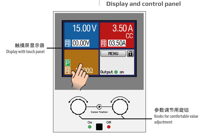 設定與實際輸出電壓、電流與功率都清晰顯示于圖形顯示器上。彩色的TFT屏幕為點觸式,用一個手指 就能控制所有功能。